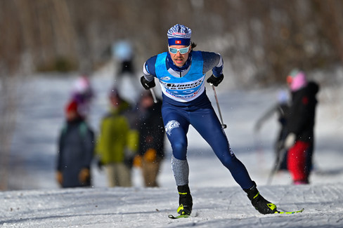The men raced first this morning with the qualifier starting at 11:00am. John Steel Hagenbuch of Dartmouth won the qualifier with a speedy time of 02:32.94. Harvard’s first-year Elias Soule made his carnival debut and came in 2nd, less than one second behind Johnny. The heats kicked off at 1:00pm, with five minutes between each. Dartmouth skier Luke Allan took the win today with an impressive showing winning both the quarter and semifinals. When asked about his day, Allan commented, “My qualifier felt good, in the heats I was aiming to be around 2nd or 3rd on the downhill section and tried to move my way through the pack in the longer working section and into the finish. It ended up being an awesome team day with four of our guys making the semis, and three of our girls!” Coming in second, by less than 0.5 seconds, was UVM first-year Finn Bailey. 3rd place was claimed by the qualifier winner, John Steel Hagenbuch. Benon Brattebo (UVM) and Keelan Durham (Williams) came in 4th and 5th respectively. Last, but not least, was Elias Soule. When asked about his race, Elias commented “the quali was awesome, I had some good tactics that I wanted to implement and I got em done.” For the heats, he had “different strategies for each one.” He also gave a shout out to coaches Cate Brams, Devin Wong, and Meg Yoder saying, “we had insanely fast skis today, definitely some of the fastest skis I’ve ever had.” Unfortunately Elias broke his pole in the final, but was still “stoked” about his day.