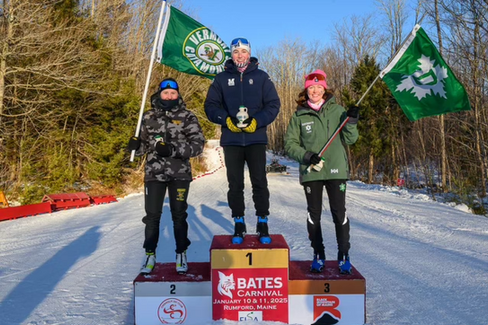 Taking the dub today was Middlebury’s Quincy Massey-Bierman. She spent last year recovering from injury and when asked about her comeback, she replied “I spent the whole year getting hungry, so it was time to eat. Roll Pants.” She deployed a strategy similar to many, talking about “starting fast because whoever was in the top had a significant advantage, which she wanted.” Following Day 1 of the Bates Carnival, Quincy is “excited to be back on the number one vibes circuit and to see her friends,” a sentiment shared by everyone today. Runner-up in today’s sprint was UVM first-year Kristin Multun Helland. When asked about her strategy for the heats, she stated that she “didn’t want to be first going into the downhill because she noticed people being caught.” Kristin also mentioned that “the finishing stretch was pretty narrow so it was hard to pass there.” Rounding off the podium today was Dartmouth junior Ava Thurston. Her teammate Evie Walton took 4th and said “that was such a fun day, a crazy little course, but it was fun skiing out there with everybody!” After qualifying 19th, Middlebury skier Mica Bodkins moved up to 5th and earned her first carnival top five. 6th place was taken by UVM junior Marielle Ackermann.